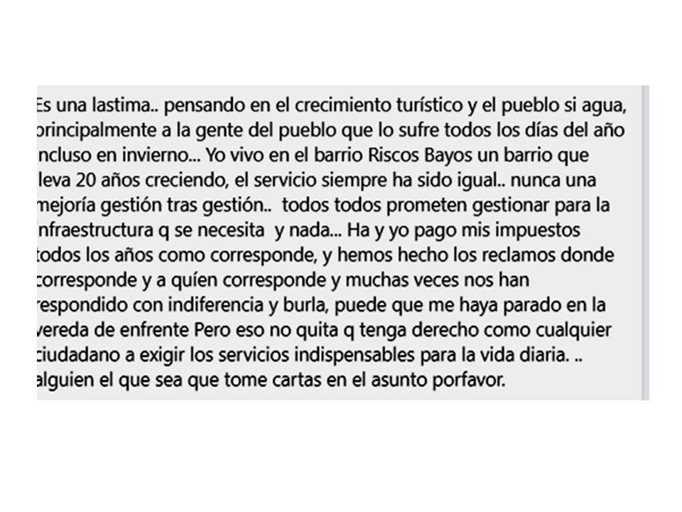 La problemática se refleja cada año, (en verano la escases y en invierno el congelamiento) con varias gestiones en el medio y muchas promesas de mejoras que en definitiva no llegan a cumplir, Unos de los barrios más afectado en Riscos Bayos, un barrio con casi 20 años, pero que a la fecha no puede establecerse como el mismo, la falta agua, mantenimiento en un tanque que no puede llenarse por completo y otros servicios esenciales hacen que el desarrollo comunitario se estanque.