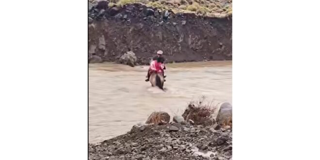 Las imágenes compartidas en el Facebook de la escuela se viralizaron rápidamente. El video que grabó el chofer del transporte muestra a los niños siendo acompañados por su padre para cruzar el cauce crecido. El “puente” improvisado que usan cuando el agua baja es apenas un tronco. Cuando eso no es posible, los caballos se convierten en el único medio para llegar.